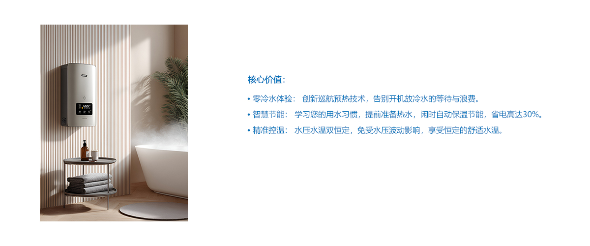 我们致力于将普通的家用电器变为懂您所需的智慧生活伴侣。这款智能热水器,通过我们深度优化的热循环系统与智能算法,实现了前所未有的用水体验。它不仅是加热水,更能管理热水。
