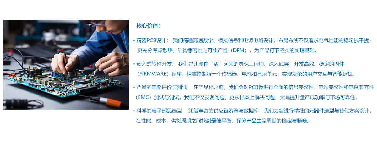产品的卓越体验,源于底层电子系统的精准、可靠与高效。我们提供从硬件到软件的一站式电子系统解决方案,确保您产品的“大脑”和“神经”处于最佳状态。我们将复杂的电子系统开发流程整合,为您提供经过充分验证的成熟方案,让您无需担心硬件与软件的兼容性问题,专注于产品本身的市场与用户。