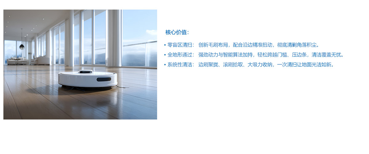 告别清洁盲区,真正所到之处,一尘不染。这款扫地机器人,专为终结边边角角的清洁痛点而生。它凭借独特的四边刷设计与超贴边算法,能紧贴墙边、精准旋入角落,将以往难以触及的灰尘、毛发一网打尽。同时,强大的越野级动力系统赋予它出色的越障能力,轻松翻越门槛、电线,平稳上下地毯,实现全屋无断点、高效率的自主清洁。